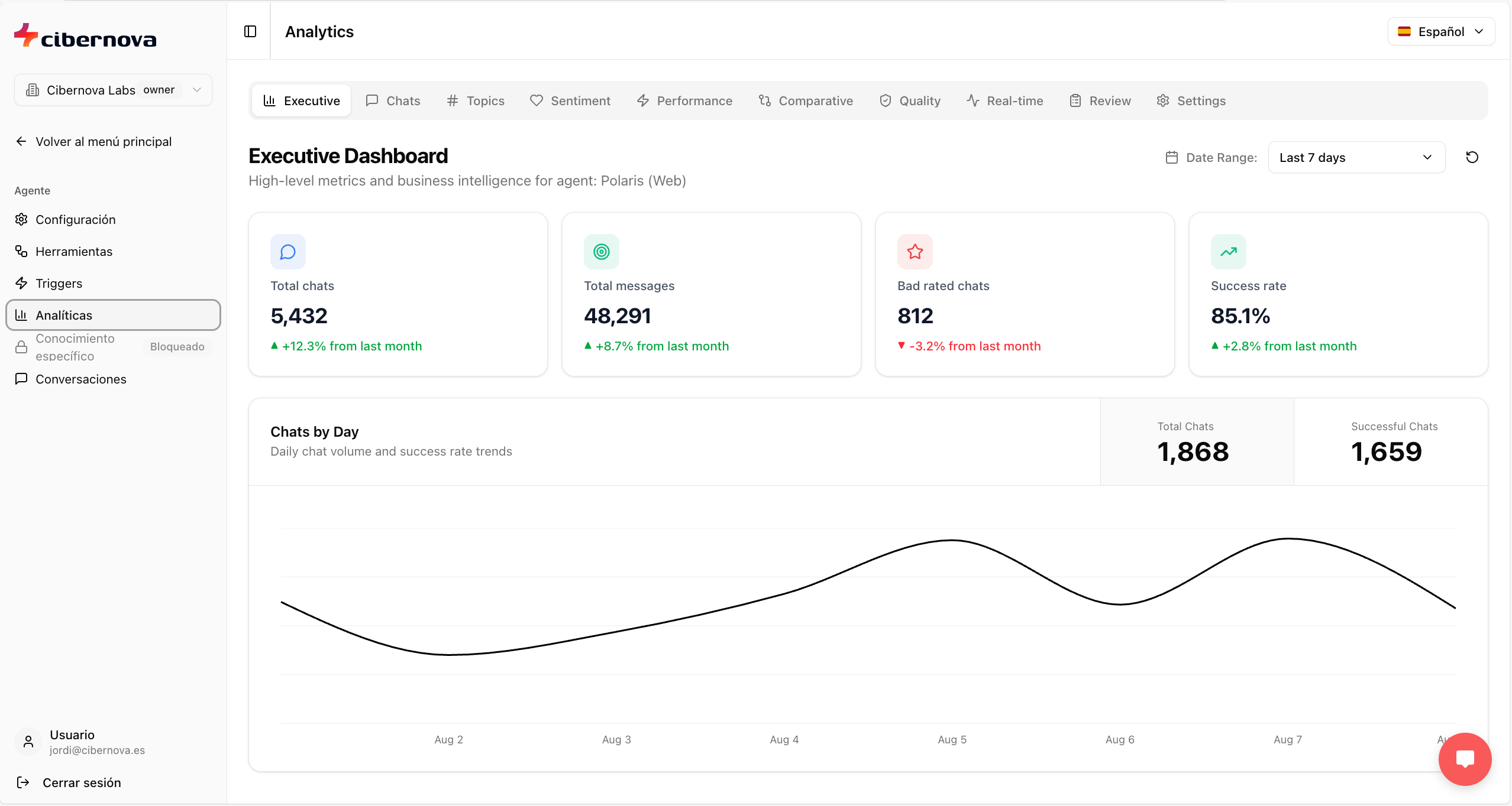 Automatiza procesos completos de principio a fin con inteligencia artificial. Observa a los Agentes IA con nuestros paneles de datos, entrénalos y disfruta de una autonomía completa.